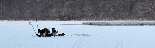 Ondanks de strenge vorst in Midden-Nederland zakte vanmorgen de eerste schaatser door het ijs. Het was op het Leersumseveld, waar vaak na enkele nachten flinke vorst al geschaatst kan worden. Zelfs na een nacht van circa 15 graden onder nul was het ijs nog niet dik genoeg midden op de ondiepe plas om het gewicht van een schaatser te dragen. Na wat schaatsen aan de kant trok Mark Bos zijn ski’s aan om het ijs midden op te testen. Het ijs was in beweging en kon het gewicht verdeeld over twee laten zelfs niet dragen. De ijsdikte was op die plek minder, mede door de invloed van de zon en de 5 cm dikke sneeuwlaag. Een duidelijkere waarschuwing dan deze is haast niet te geven.