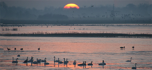 Vanmorgen hadden onze Scandinavische vrienden de Wilde Zwaan, in het Fries de Kloekswan, het mooie ijs op de Ryptsjerksterpolder in bezit genomen. De prachtige zonsopgang met duizenden brandganzen (Paugoes) en Kolgans (Blesgoes) maakten het plaatje compleet. Als natuur- en ijsliefhebber is het genieten. Helaas komen we niet op de schaats deze week alhoewel Albert Romkema Rotstergaast was op de schaats vanmorgen op 2 cm ijs ,laten we het als een experiment beschouwen! Vanuit een zonovergoten Friesland met het blinkende ijs kan mijn dag niet meer stuk!