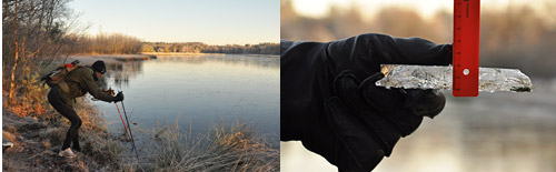 Deze novemberdagen blijkt Koning Winter weer in het land te zijn. Vooral in de nacht levert dat het eerste natuurijs op; zo ook op een van de koudste plekken van Midden-Nederland: het Leersumseveld. We onderzochten de ijsdikte en constateerden dat 1,6 cm toch echt te dun is om ook maar één voet op het ijs te zetten. Nu komt er helaas nog maar één koude nacht en dat levert een toch te dunne ijsvloer op om zelfs voor waaghalzen het ijs op te gaan. Maar wel zeer mooi om te kijken en te luisteren.