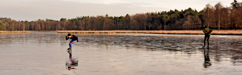 Even kon het vanmorgen. Op 3,5 cm dik ijs waren de eerste schaatsers op het ijs van Leersumseveld in de Provincie Utrecht. Na drie nachten vorst is het vaak mogelijk op deze ondiepe plassen tussen Leersum en Veenendaal te schaatsen. Deze plek is een van de koudste plekken van de Utrechtse heuvelrug. Gewapend met een laddertje om de zwakke zijkanten te overbruggen klommen de eerste schaatsers op het ijs. Het ijs had net genoeg draagkracht om slechts enkele schaatsers te dragen. Ook liep de temperatuur in de loop van de morgen al snel op. De vreugde was misschien van korte duur, maar de schaatsers hadden wel een bijzondere primeur.
