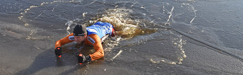 Ook gemalen zorgen voor stroming in het water, daardoor kan het ijs aan de onderkant afkalven; het wordt dunner zonder dat je het ziet. Dooi en zon maken het ijs nu snel brozer. Het is echt wachten op nieuwe vorst voordat schaatsen weer veiliger kan worden. Blijf maar liever op het ondiepe water als je leven je lief is. Of…zorg voor de benodigde hulpmiddelen.