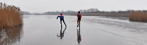 Voor schaatsliefhebbers is het zeker in een winter met korte miniwinters moeilijk om geduldig af te wachten. Als je jaren gewacht hebt op ijs en dan ligt het er, dan wil je er zo vroeg mogelijk op en er zolang mogelijk op blijven. Maandag 23 januari 2017 werd nog driftig geschaatst op de plassen bij Ankeveen. Over ondiep en dieper water. Tot het einde toe. Maar wanneer is eigenlijk het einde? Veel schaatsliefhebbers stellen dit steeds meer proefondervindelijk vast. Gelukkig zijn er ook steeds meer mensen met ijspriemen en touwen, die ook elkaar kunnen helpen. Toch zullen we nu weer even geduldig af moeten wachten tot de ijsvloer dikker wordt.
