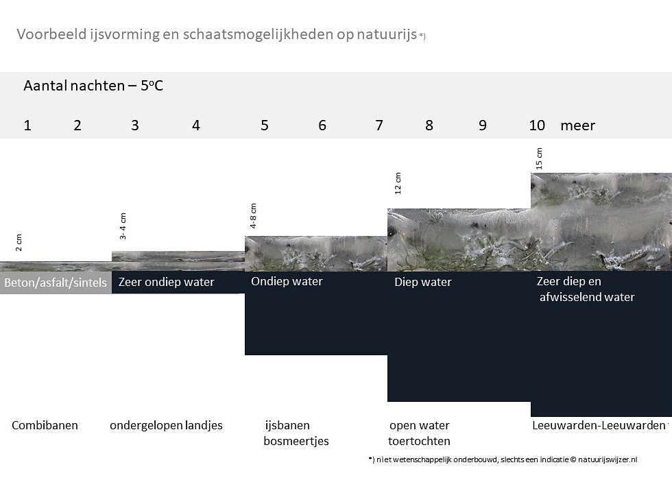 Terwijl de regen nog uit de hemel neerdaalt hebben sommige kranten en andere media al weer gemeld dat er geschaatst kan worden. Soms zelfs met de belofte: “na het weekend kan geschaatst worden”. En dus is de gekte weer begonnen. De schaatsen gaan weer massaal uit het vet. In . Papier is geduldig. En dus worden de verwachtingen weer ook hoog gespannen. Maar hoe zit het nu echt met wat we verwachten kunnen? De eerste groep mensen die dat kan vertellen zijn natuurlijk de meteorologen. Zij hebben zicht op de modellen, zijn gewend deze te interpreteren, te vergelijken, te wikken en te wegen. Dus moeten we af gaan op deze kennis en ervaring. Maar voor de vorming van ijs spelen veel factoren een rol. En dus is het allemaal zeer complex. Maar ook wij zijn alweer benaderd tot het doen van uitspraken. Dat kan, maar die zullen dan altijd globaal zijn en nooit hard. We waagden ons aan een infographic over ijsvorming en schaatsmogelijkheden. Gewoon als indicatie omdat er in sommige kringen veel onbekend is waar als eerste veilig geschaatst kan worden.