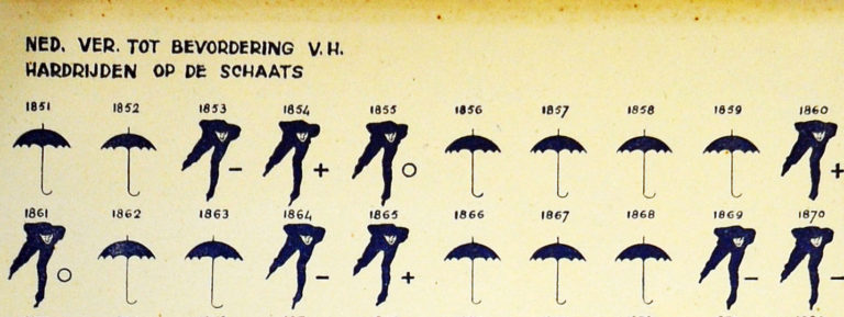 Maar hoe zit het dan met die slappe winters? Waren die er vroeger ook? Ja hoor en niet zo weinig ook! Kijk maar even op de kaart van de Nederlandse Vereniging tot Bevordering van het hardrijden op de schaats. En kijk eens naar de jaren 1856 tot 1876. In deze twintig jaar kon er zeker niet elke winter geschaatst worden.