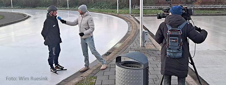 In de vroege morgen een interview over het verloop van de nacht om weer de ijsvloer te preparen. Het is altijd weer een spannend avontuur het samenwerken tussen de weersomstandigheden en het inspelen daarvan met de ijsmeesters die de techniek in handen hebben.