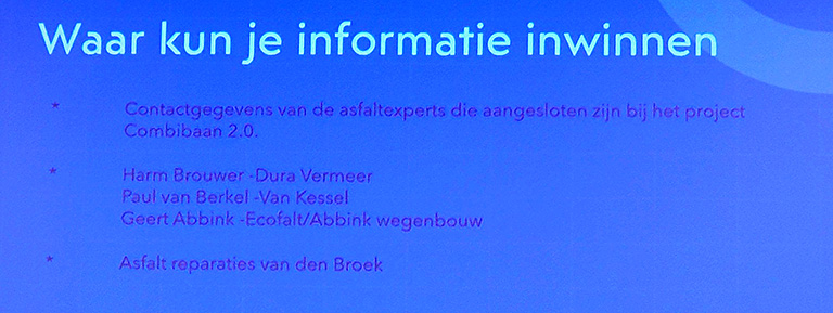 Ger Beernink vult aan met de eerste ervaringen van het Field lab van Universiteit Twente. In een proefopstelling wordt gebruik gemaakt van 4 ijsbaantjes van 2 x 2 m. Op veel plaatsen zijn sensoren ingebracht. Naast de eigen metingen wordt ook gebruik gemaakt van de gegevens van het KNMI. In de proeven is schuimbeton gebruikt van de kwaliteit CB 550; dit is zeer sterk. In een Expertgroep van diverse deskundigen worden de resultaten besproken. Verwacht wordt dat in maart de eerste gegevens beschikbaar zullen komen.